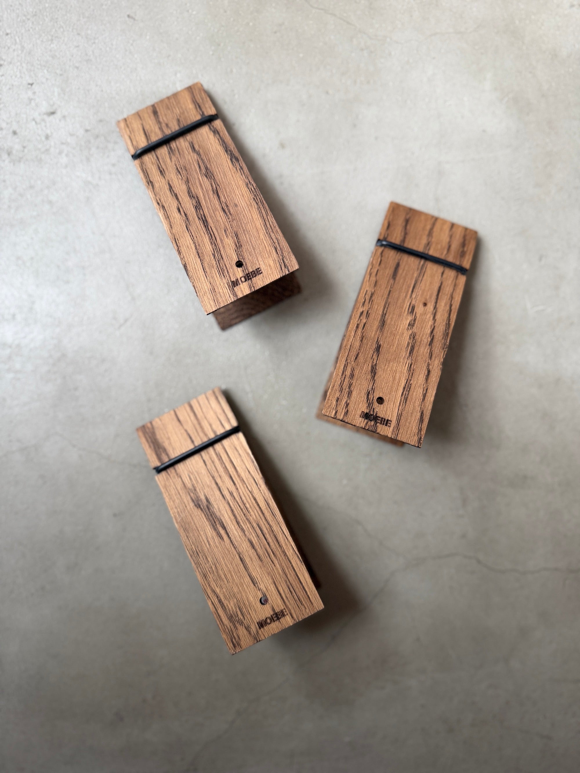 オーク材二枚と輪ゴム一 本。これで完成です。ピンチは立てて使用することも、背面の穴を使って壁に掛けて使用することもできます。先週末のコンサートのチケットや、愛する人からの手書きのメモを、庭で拾った枝葉でもいいです。私たちの生活の中の小さな記念品を忘れないように留めておいてください。